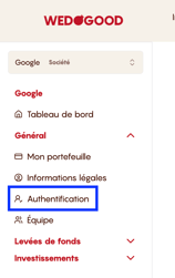 1. Rendez-vous sur votre tableau de bord, dans votre espace société, puis allez dans la rubrique « Authentification » sur la colonne de gauche
